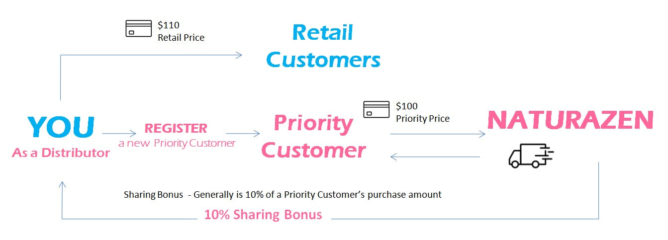 There is no cost to become a NATURAZEN's Brand Distributor and no required purchase of products. Furthermore, Brand Distributors earn Retail Profits and Sharing Bonuses when products are sold to Customers.